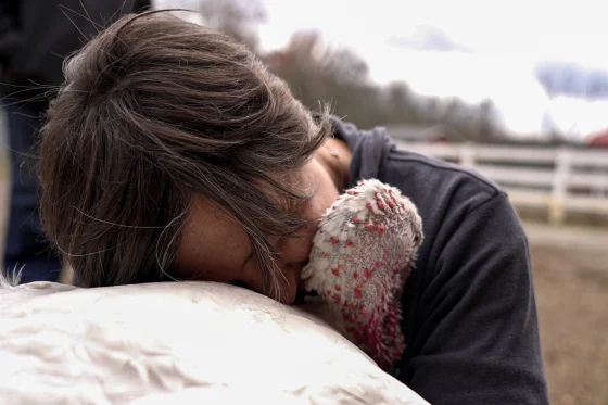 Ellie Laks, founder of The Gentle Barn, gently sat beside a turkey named Serena as she explained the experience. โYou can sit close, give them kisses on their soft pink heads, and just relax with them,โ she said.