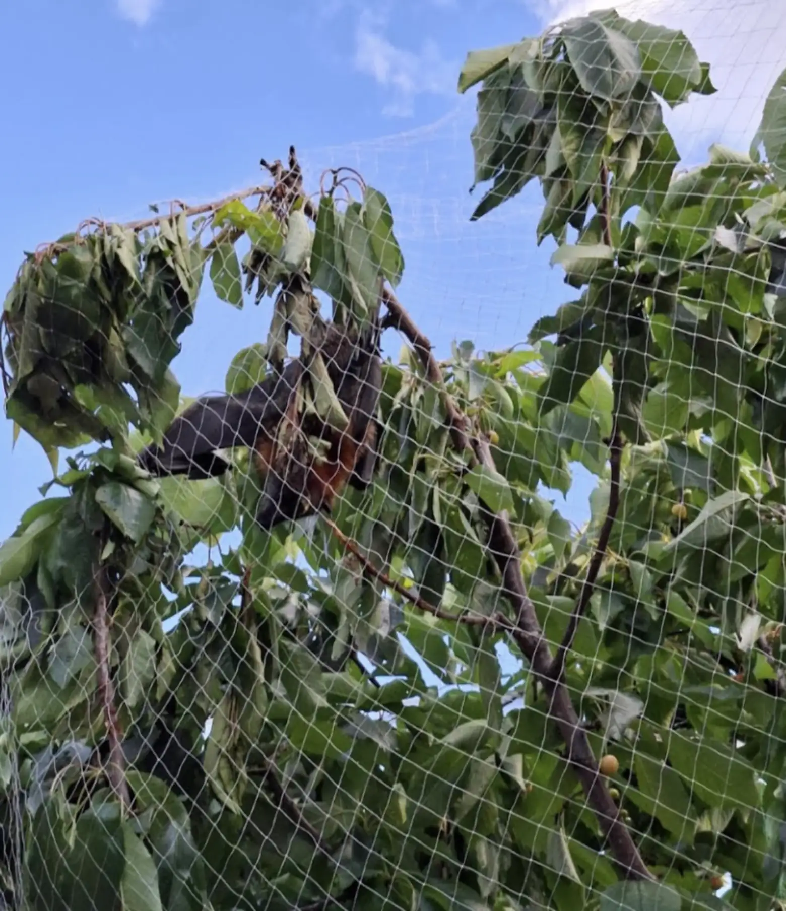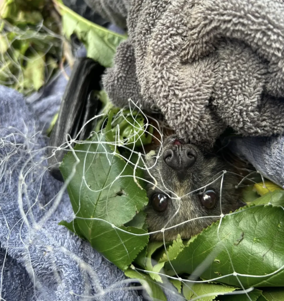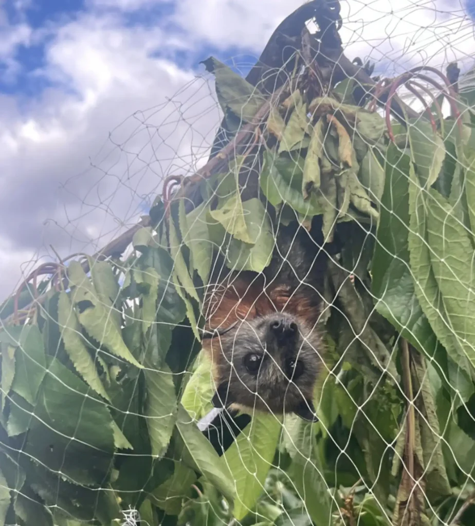 The bat had likely been trying to reach the fruit when she became stuck in the net. Unable to free herself, she was left injured and trapped.