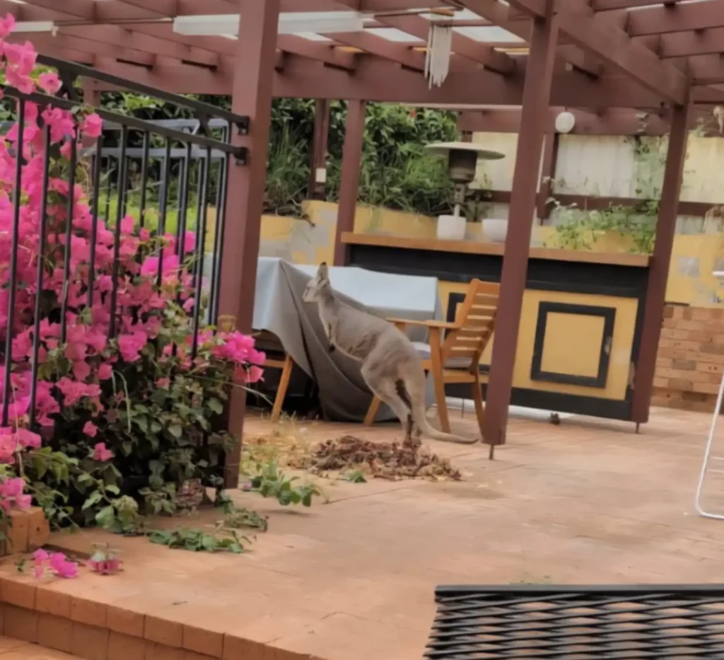 After assessing the property, Inga identified the safest spot for the animal to descend — an area just above the patio. Keeping a respectful distance so as not to startle him, she gently guided the wallaroo toward the edge.