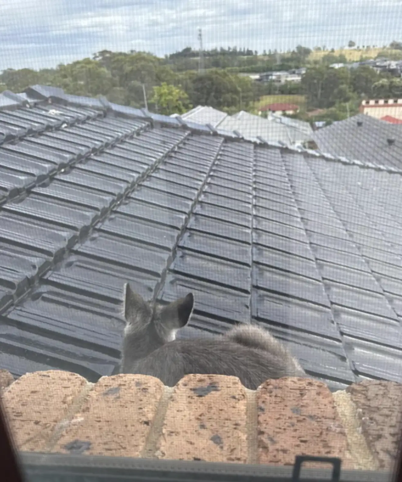 Upon arriving, Inga joined the couple upstairs and found the wallaroo calmly perched on the roof, appearing completely unbothered by the situation.