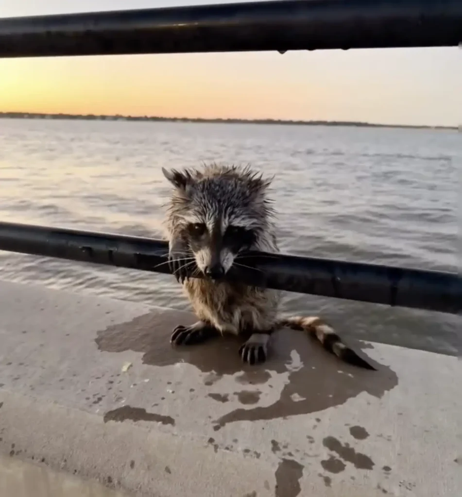 The drenched raccoon paused for a moment, catching his breath, then scurried off toward the safety of dry land β€” free once again.