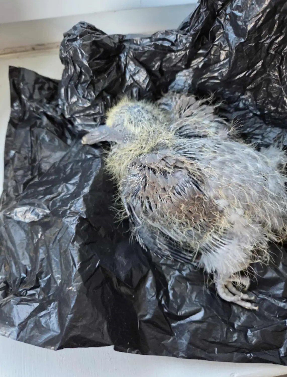 With nothing else on hand, the woman gently wrapped the fragile bird in a dog waste bag to keep him warm and hurried to Forest Flock Pigeon Sanctuary for help.