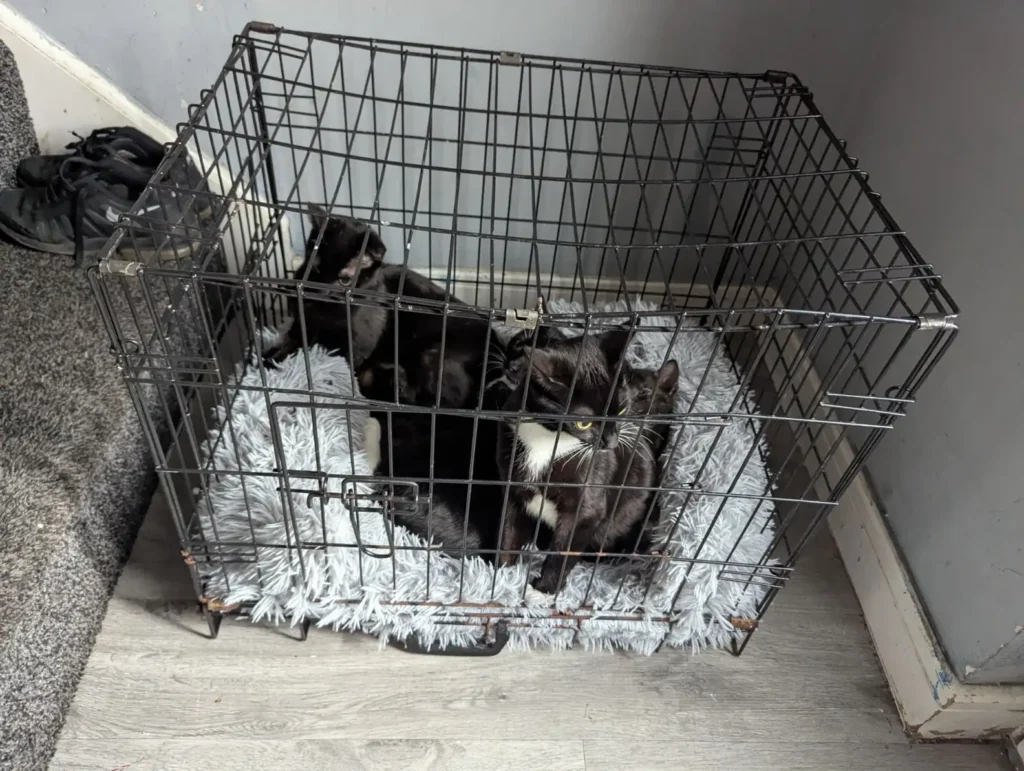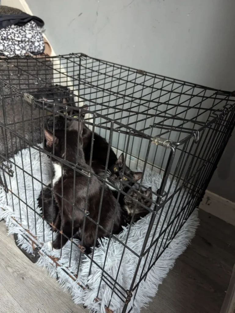 Inside were five black cats, two of them tiny kittens, all crammed together and shaking with fear. The crate had landed in some bushes along a small alley, and the woman quickly pulled it out and carried the frightened animals home. She then contacted the RSPCA, who were horrified by what had happened.