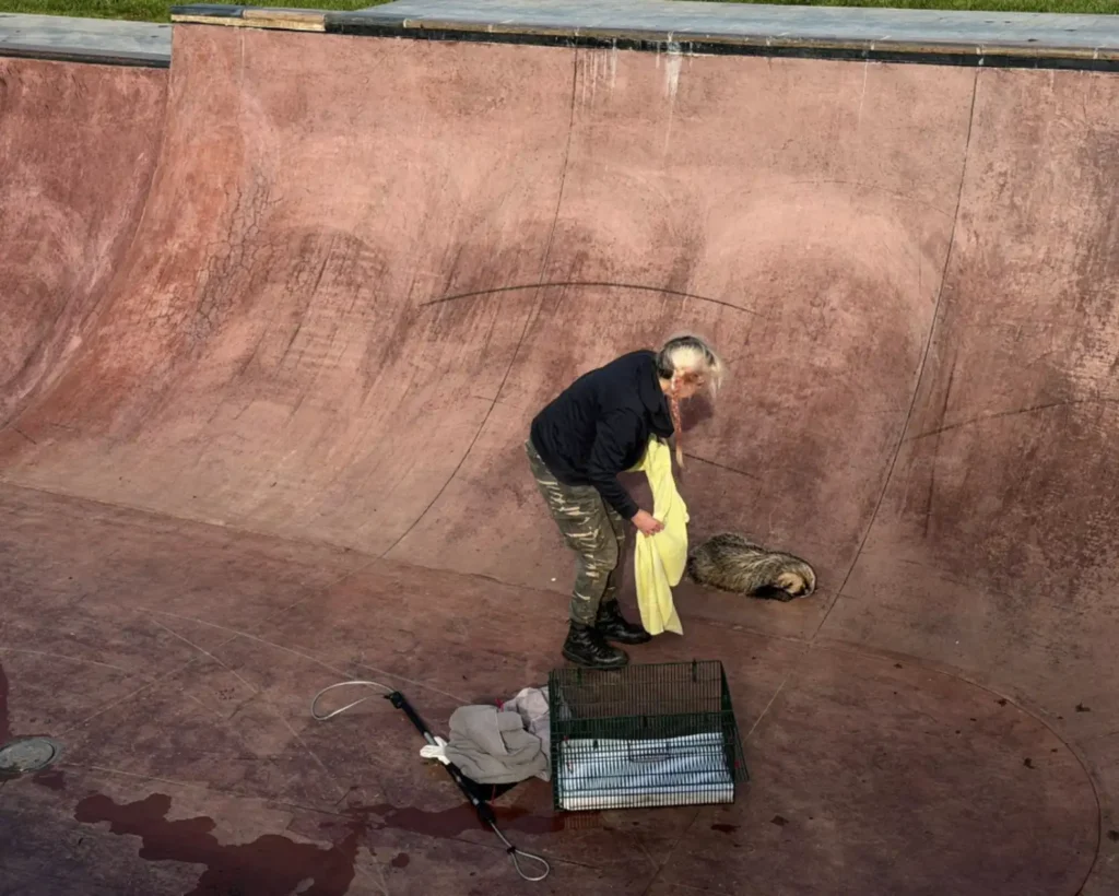 Scotland carefully climbed into the skate bowl with her equipment. As she approached, she could tell the badger was tired but still alert — and likely to defend herself if needed.