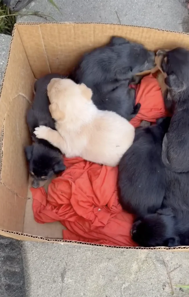 Using the mop handle, Jeremy gently guided each pup forward until Hall and Lori could scoop them up. One by one, six little babies were pulled to safety — tired, dirty and softly crying, but alive.