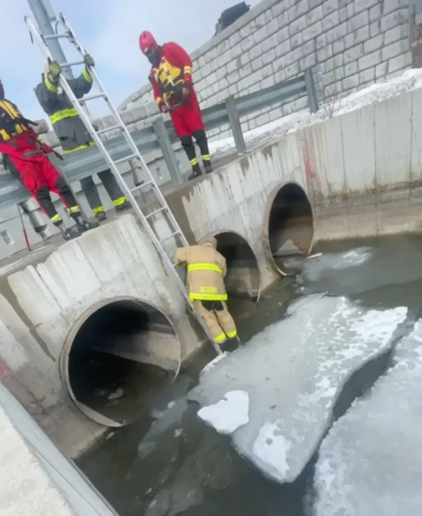 In six-degree Fahrenheit temperatures, Michigan Humane team members suited up in wetsuits and descended a ladder into the icy culvert below.