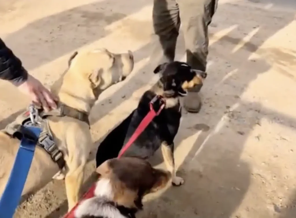At first, the dogs growled at the strangers. However, after a few calm moments, they began to relax and trust the men.