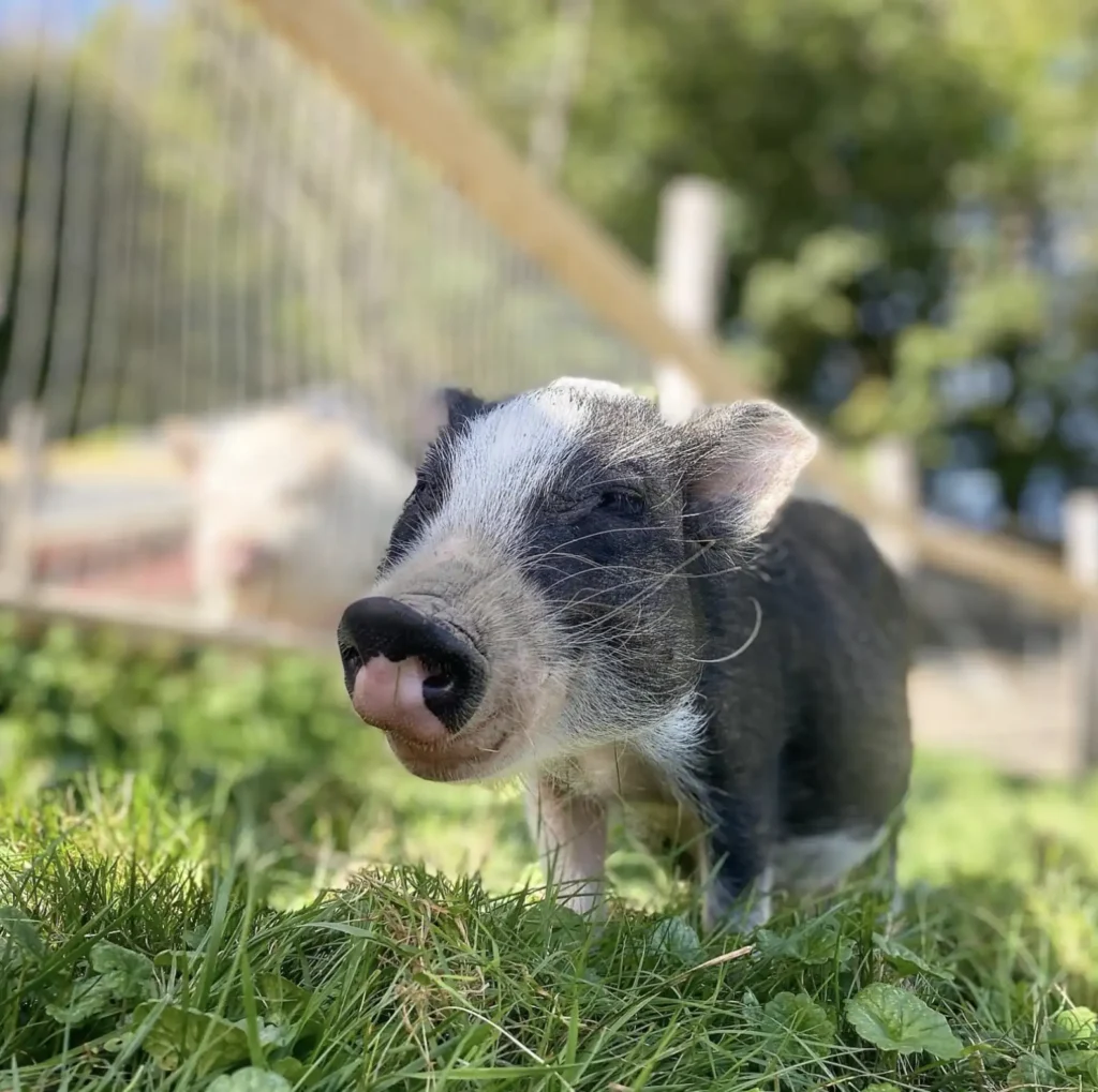Thanks to intensive medical care, Sparky slowly began to recover. His hair grew back, revealing a striking black-and-white coat, and he started to gain weight. For his first two years at the sanctuary, Sparky lived indoors alongside another rescued pig, Autumn, sharing the sanctuary founderโs home and even her bed at night.