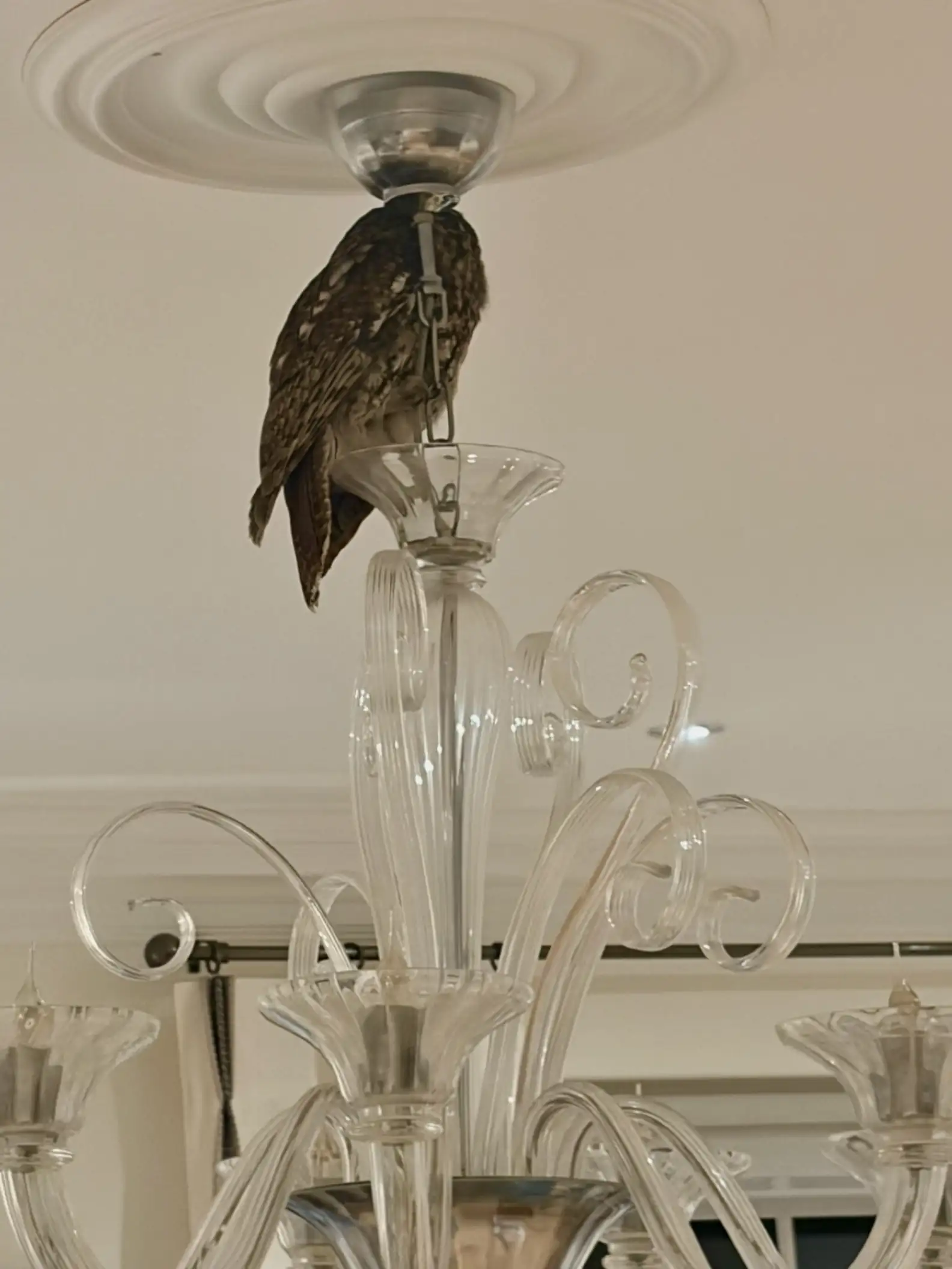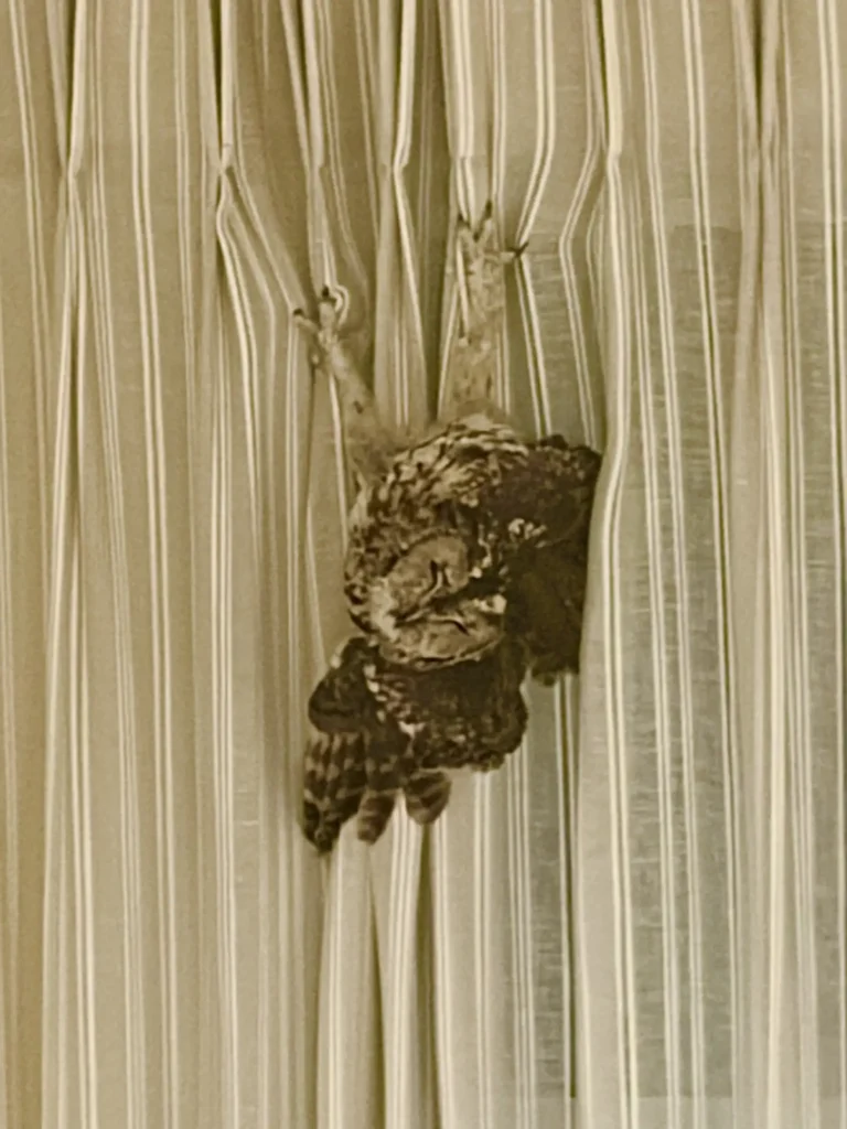When the homeowners woke up, they were greeted by a scene they could hardly believe. One tawny owl was calmly perched on the chandelier, fast asleep, while the other had managed to tangle itself upside down in the curtains.