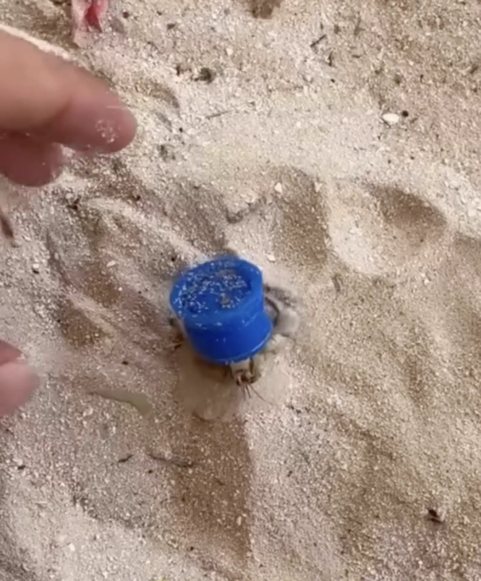When they got closer, the mystery became clear. The moving object was a blue bottle cap being carried around by a hermit crab.