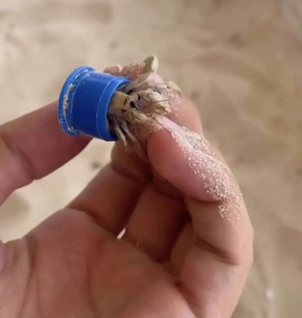 The sight was both surprising and upsetting. Hermit crabs normally search for empty shells to use as protection, but this one had ended up living inside a discarded piece of plastic instead.