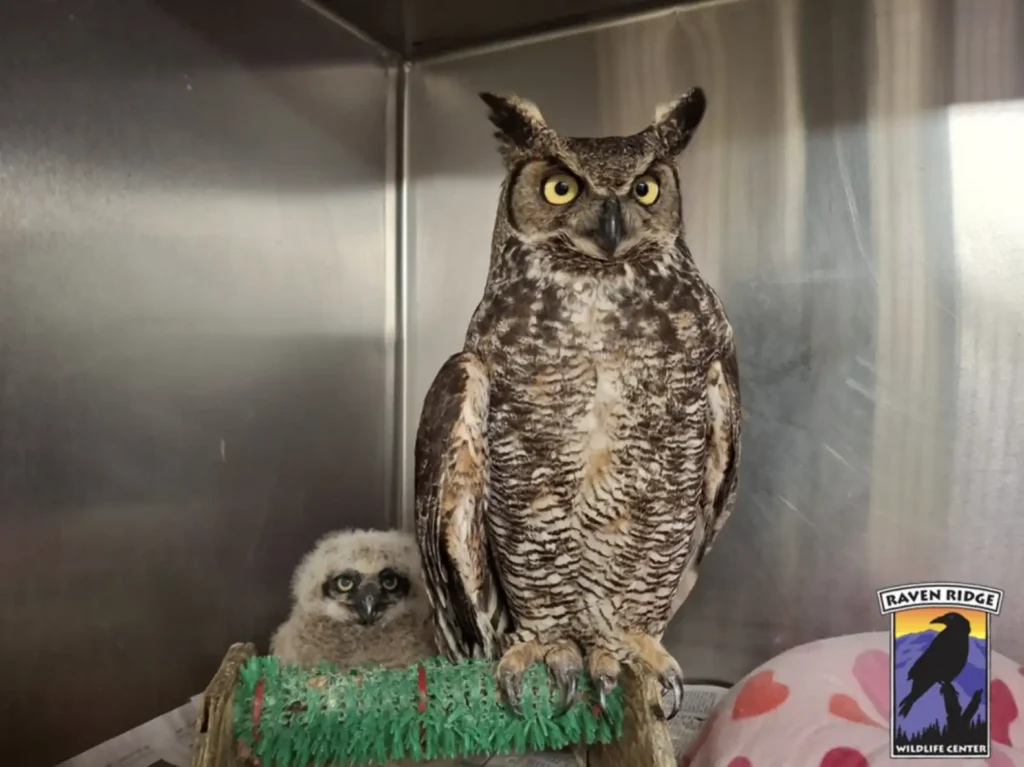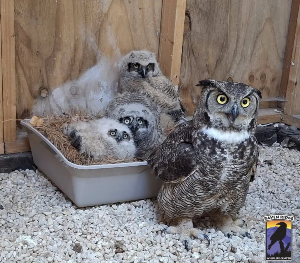 Fortunately, the center had recently taken in an injured adult female great horned owl. She had been rescued after getting her wing caught in an electric fence around a chicken coop. While examining her, Young noticed something important — the owl had a brood patch on her belly, a sign that she had likely been caring for eggs or chicks not long before.