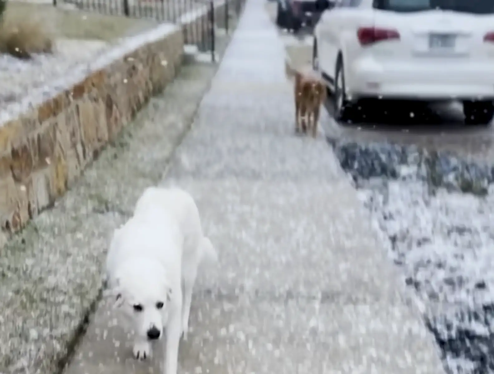 On New Year’s Day, Joel and his husband were taking their dog, Wellington, for a peaceful walk around their neighborhood when something unusual caught their attention. Standing quietly outside their home was a large, snow-white dog they had never seen before.