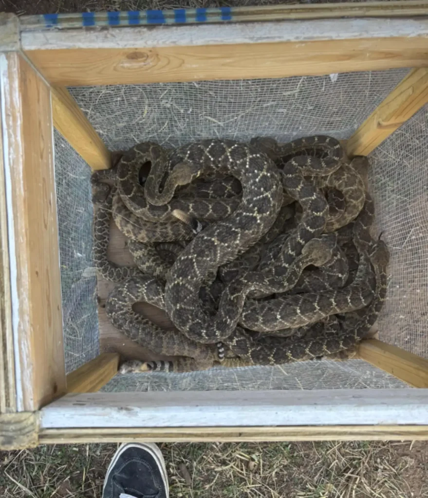 When Parker slowly lifted the plastic sheet, he was stunned by what he found. Coiled together beneath the tarp were 29 snakes β including 16 rattlesnakes, nine western coachwhips, and four Great Plains rat snakes.