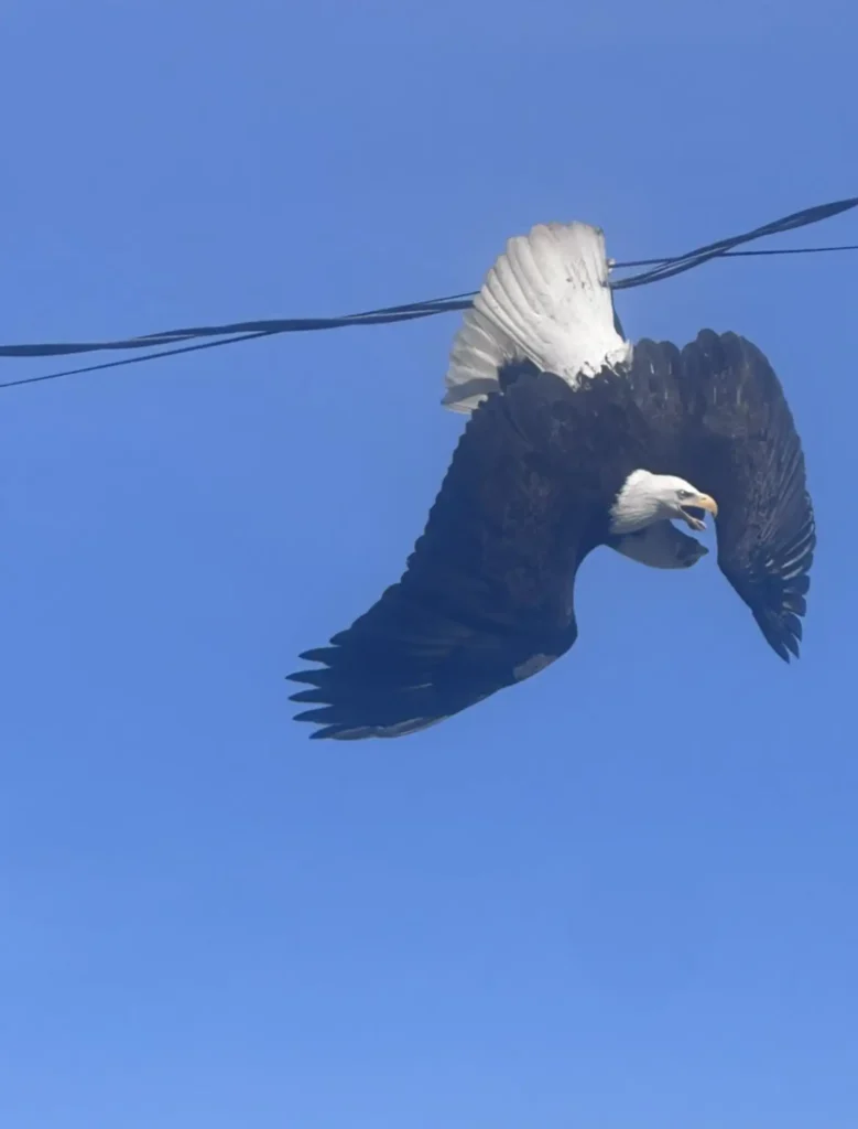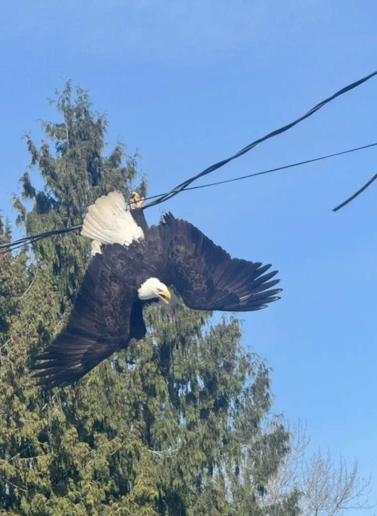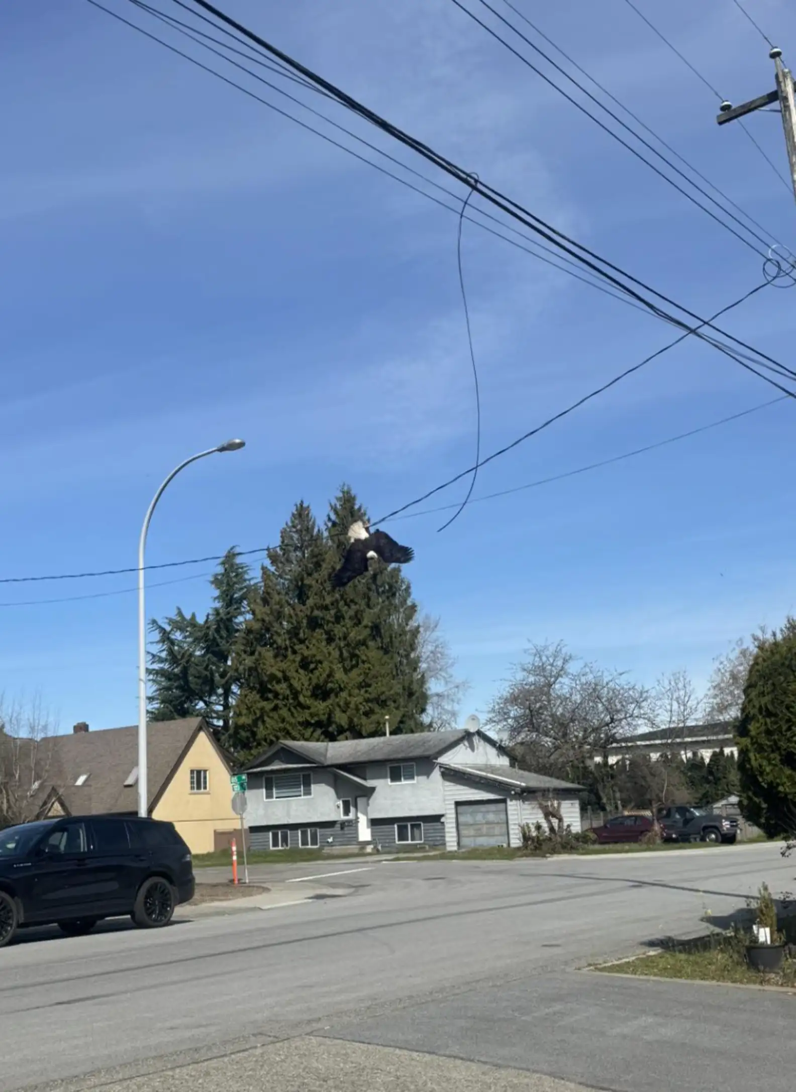 It started as an ordinary day in Surrey, British Columbia — until a man walking down the street looked up and spotted something extraordinary: a bald eagle hanging from a power line overhead. As he moved closer, the scene got even stranger. There wasn’t just one eagle — there were two, their bodies suspended in the air, seemingly fused together.