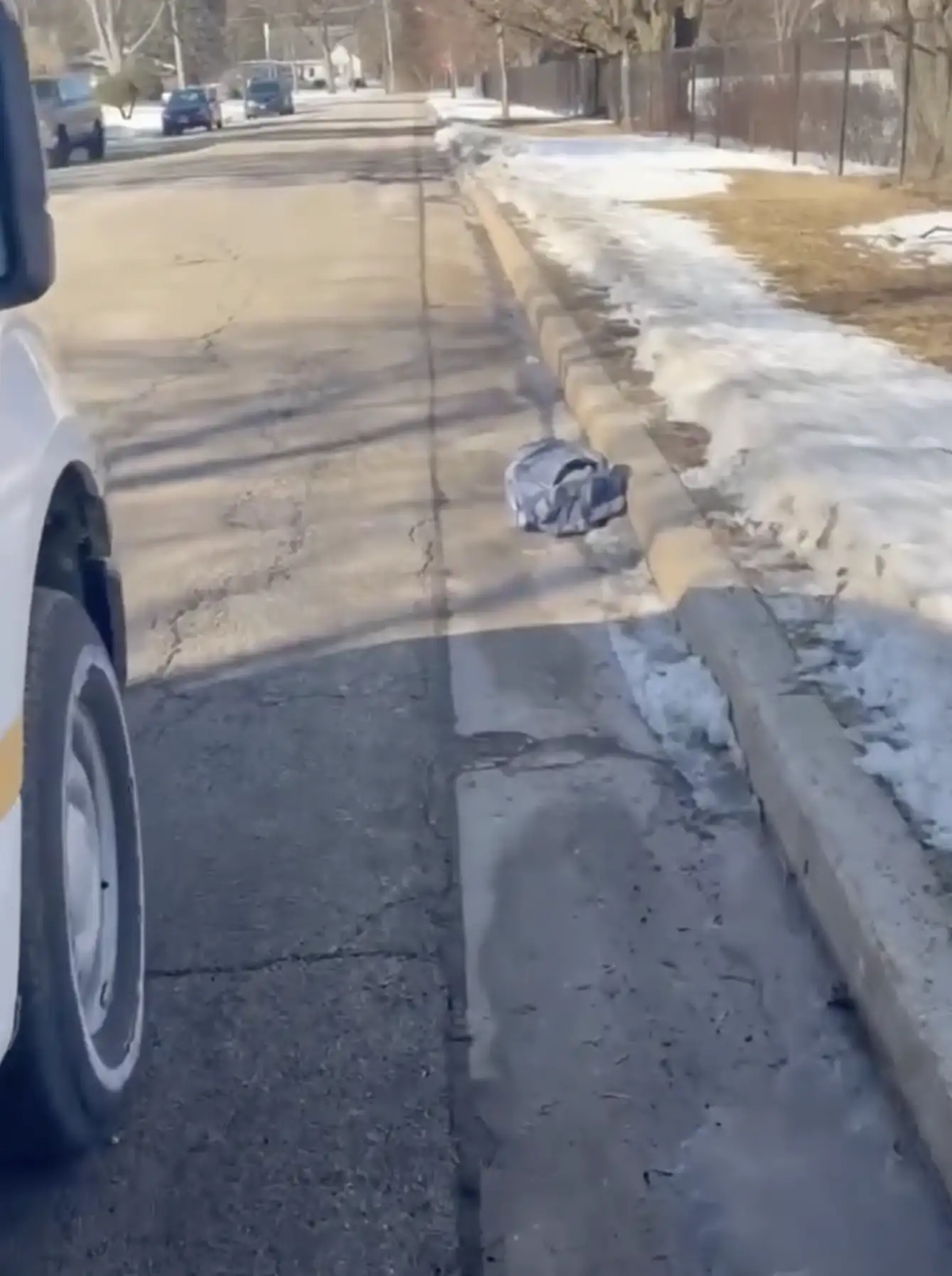 On a cold winter day in northern Illinois, officers with Waukegan Police Animal Control noticed something unusual sitting near a snow-covered curb β a soft mesh carrier with movement inside.