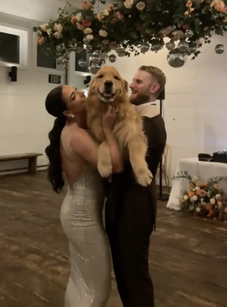 The couple went all in. Subtle nods to Wally were everywhere — from cocktail napkins featuring a golden retriever lounging in a martini glass to small design details on the seating chart. But they also wanted him front and center during the ceremony.