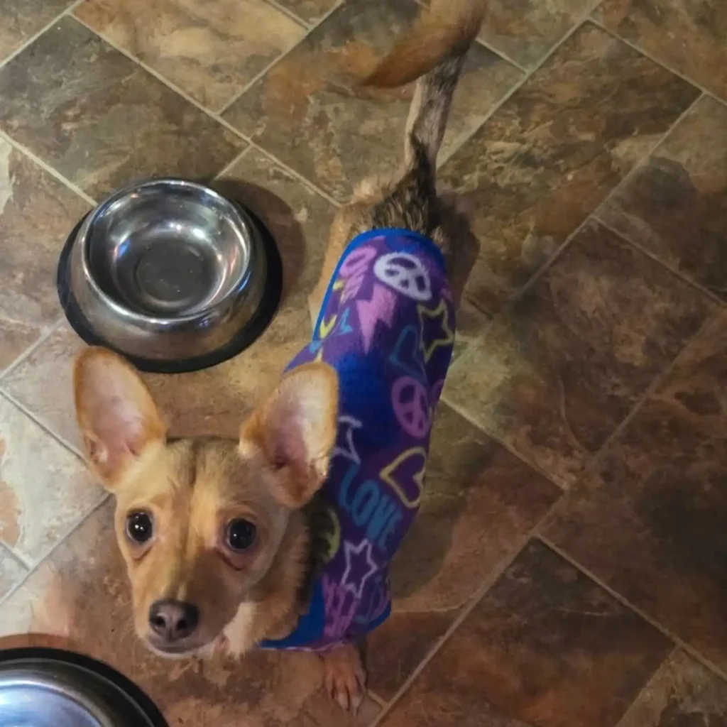 With food, warmth, and affection, Gilligan blossomed. He started going on walks, playing, and trusting again. His weight nearly doubled in just 10 days — from under 5 pounds to around 9. He even became the proud owner of a whole new wardrobe!