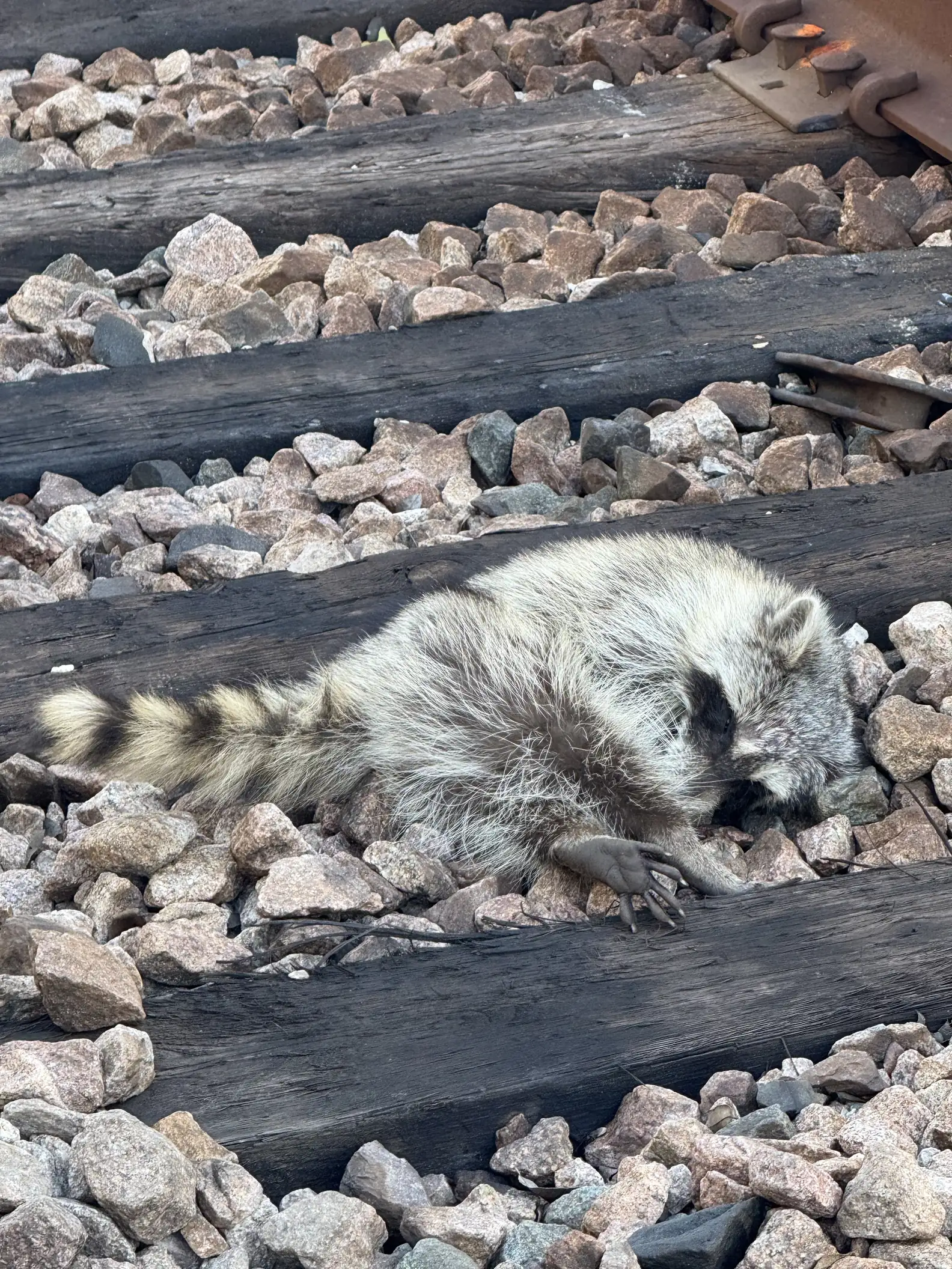 While carrying out routine repairs, a team of railroad workers noticed what appeared to be a motionless figure stretched across the tracks. At first, they feared the worst β until they saw a faint movement. When they approached, they realized the still form belonged to a raccoon who was barely hanging on.
