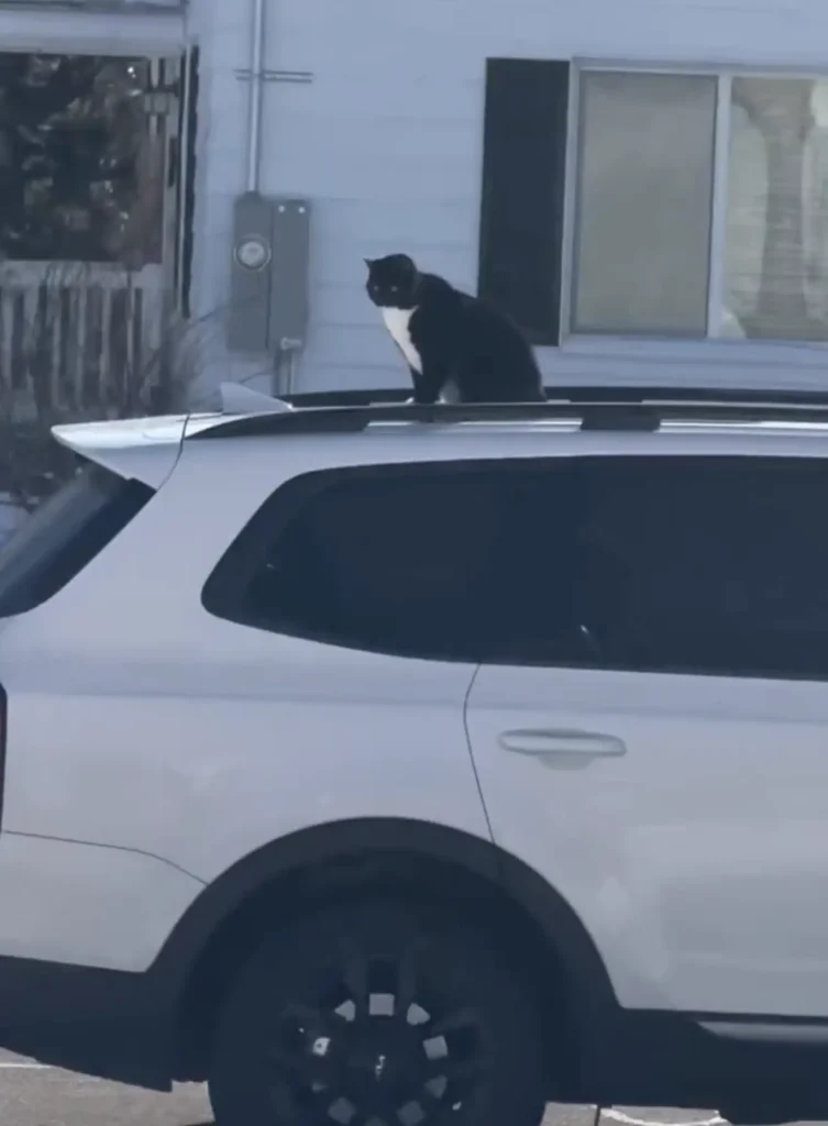 Thanks to the alert neighbors shouting, “You have a cat on your car!” Bruce made it home safely.