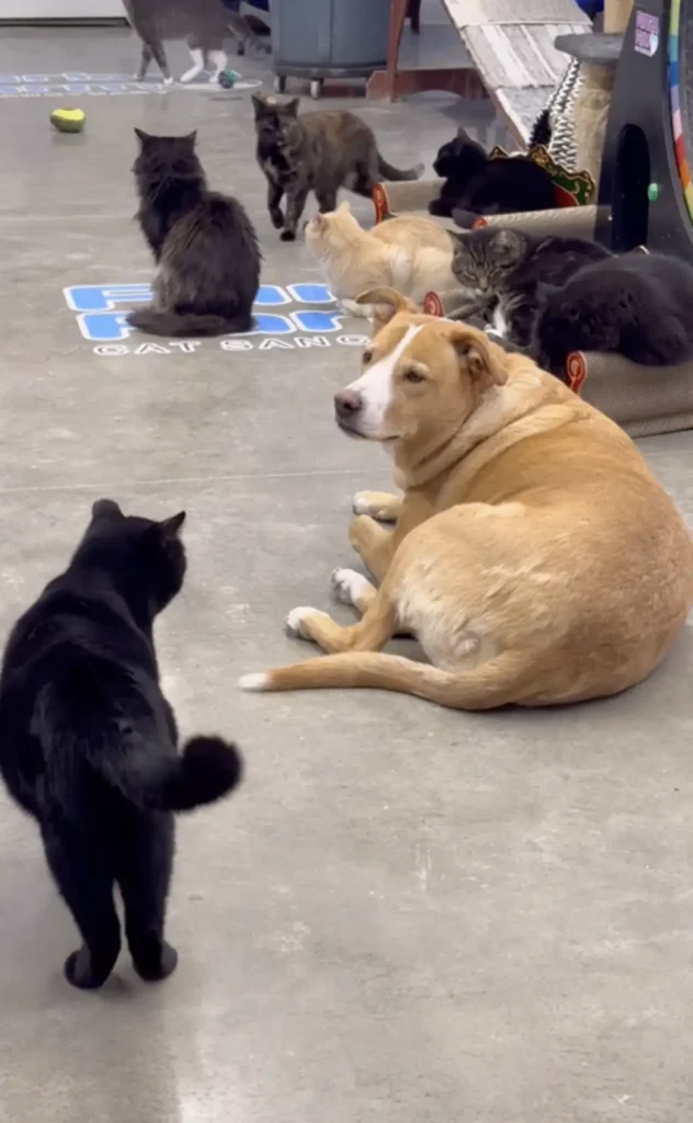 While Bella has never shown aggression toward the cats, the team is mindful that not every cat enjoys canine company. Those who prefer their space are kept separate, ensuring everyone remains comfortable. Still, Bellaโs presence has provided an unexpected benefit.
