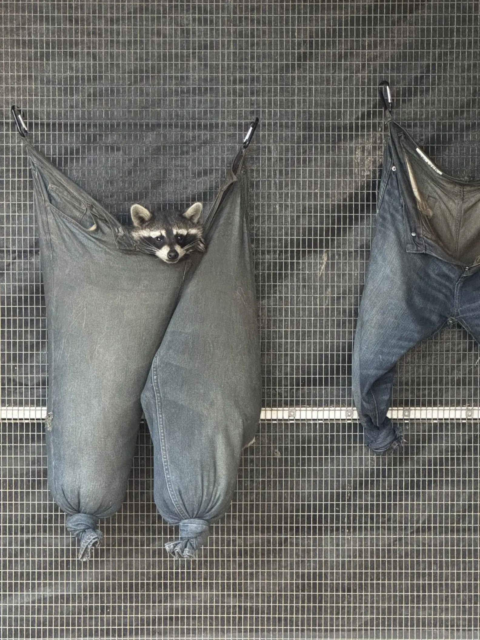 The concept is surprisingly practical. Once the pants legs are knotted shut, the jeans are clipped to the walls of the enclosures using carabiners, creating a snug, sling-like space for the animals to crawl into. And crawl in they do β often several at once.