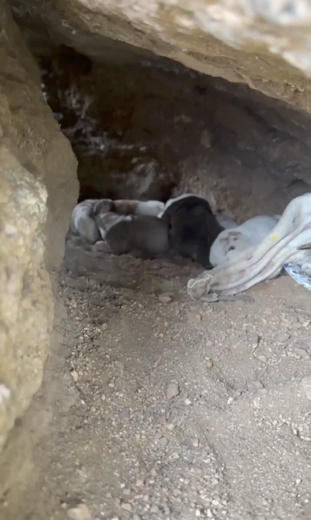 Thankfully, the landowner had noticed the dog barking from inside the rocky opening and also heard the faint sounds of newborn puppies. Realizing something was wrong, she contacted rescuer Faith Easdale for urgent help.