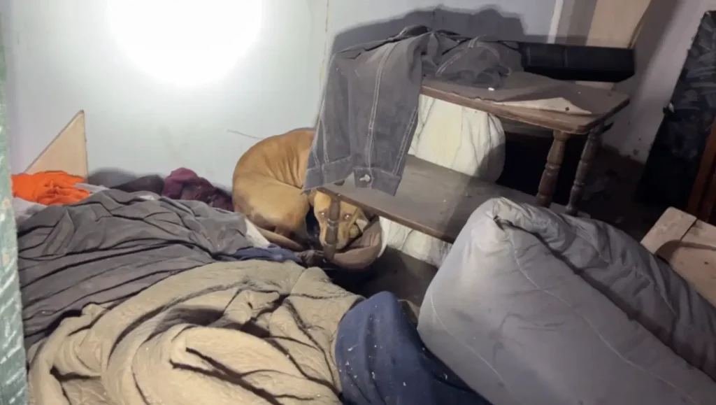 Led by seasoned rescuer Donna Lochmann, the team entered the first empty home on the block. They hoped they’d spot the dog quickly — and to their relief, they did. Two shining eyes peeked out from beneath an old piece of furniture.