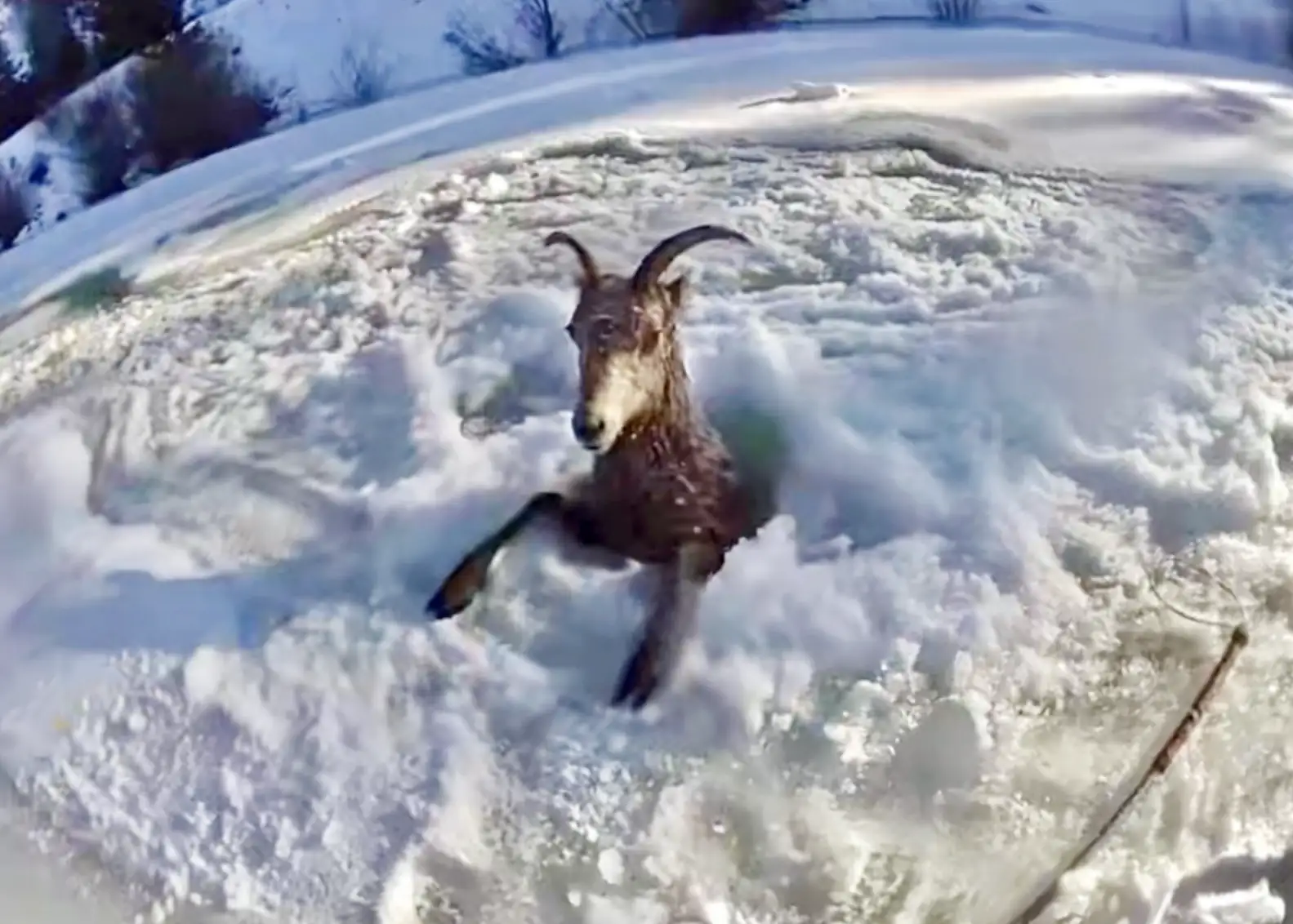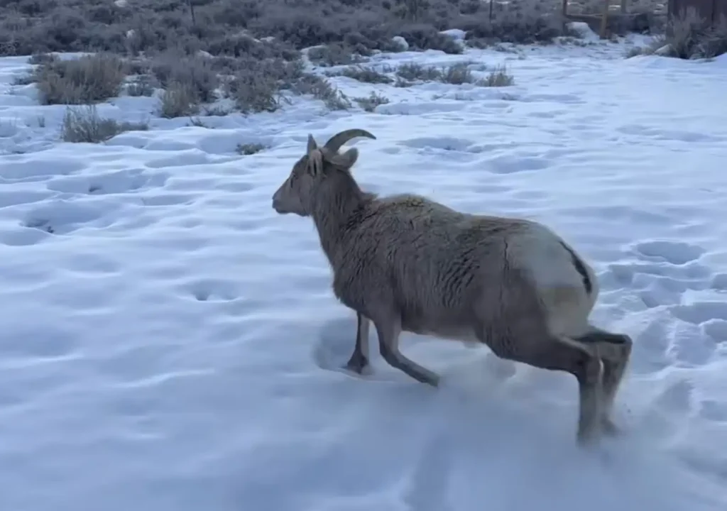 When the rescuers arrived, they saw a Rocky Mountain bighorn sheep fighting for her life. She had likely tried to cross the frozen river, only to break through the ice and become stuck.