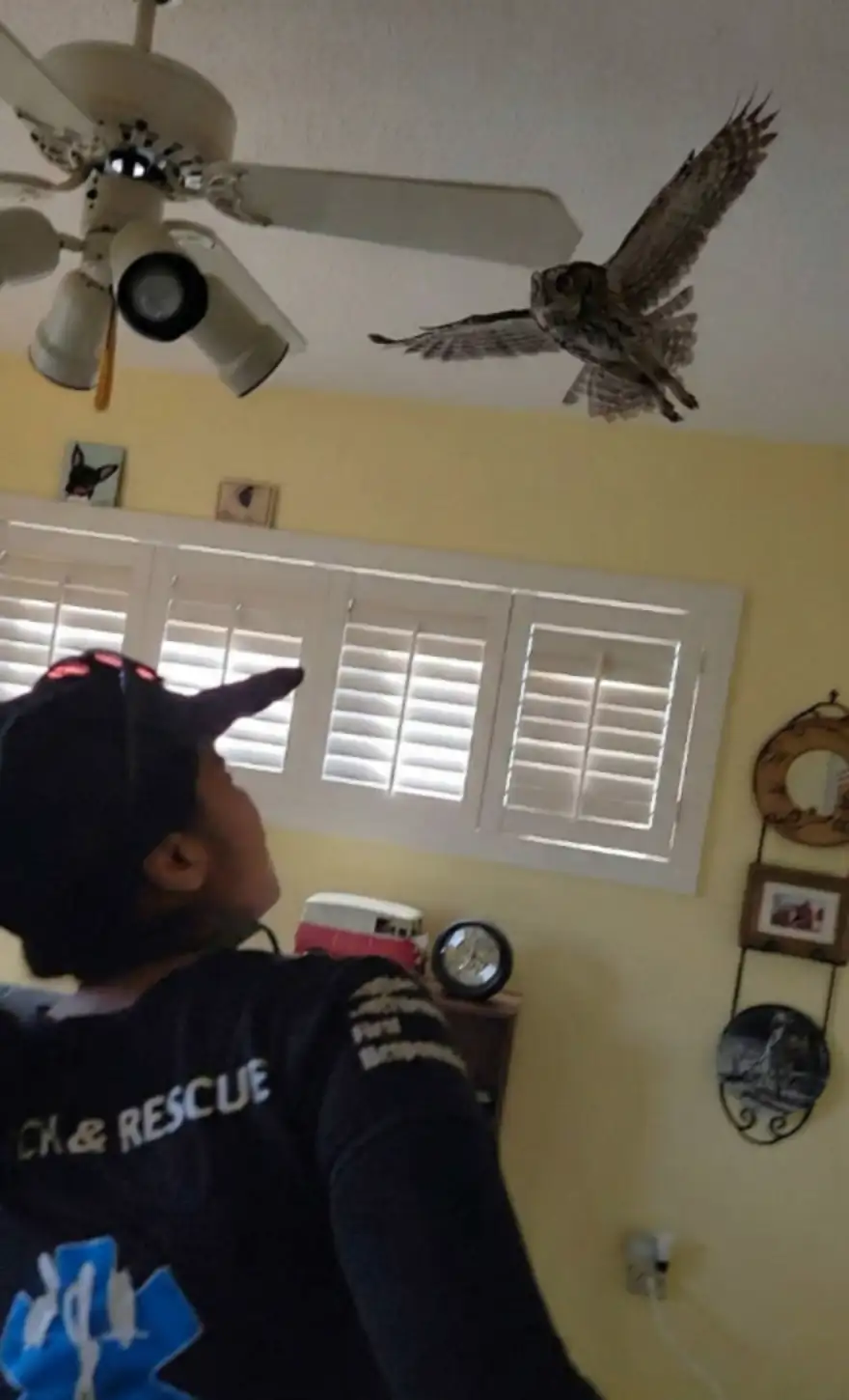 The bird took a short, self-guided tour through the home before landing on a bedroom mirror. The rescuer safely captured the owl in the net without incident.