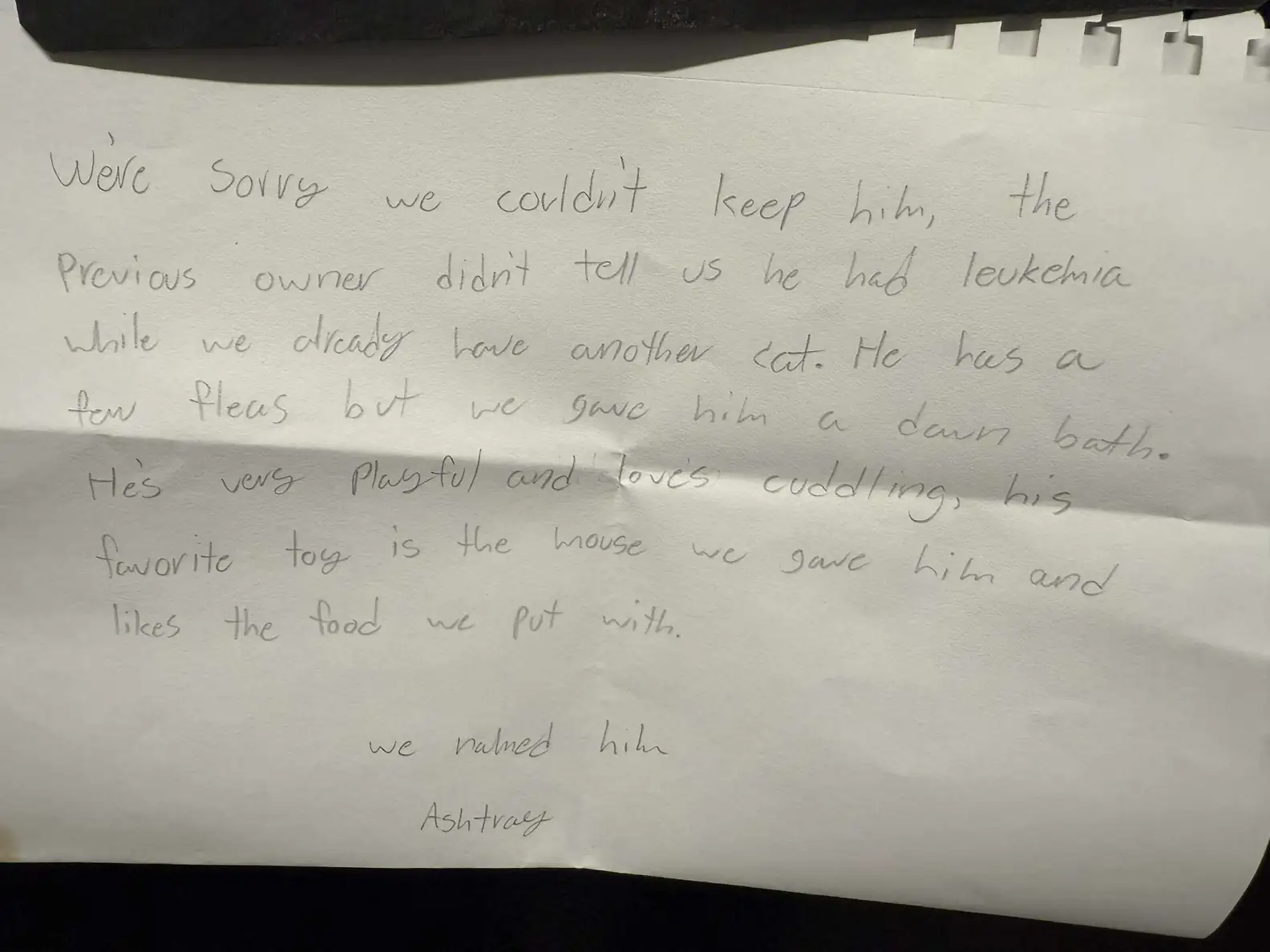 βWeβre sorry we couldnβt keep him,β the note read. βThe previous owner didnβt tell us he had leukemia while we already have another cat. Heβs very playful and loves cuddling. His favorite toy is the mouse we gave him and he likes the food we left.β