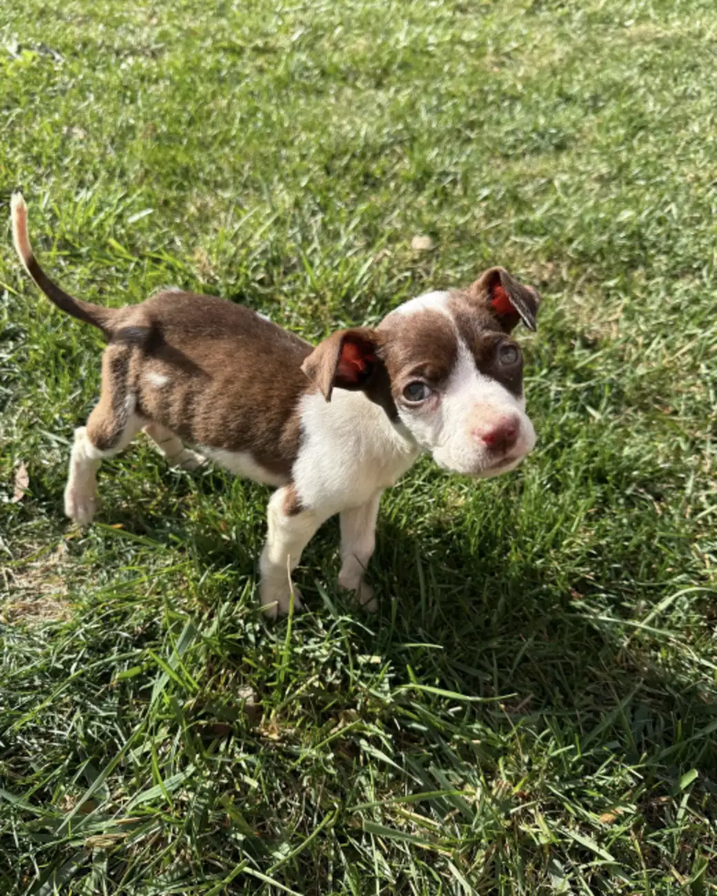 Near a dumpster, he noticed a tiny puppy desperately picking through trash. The white-and-brown pit bull mix was painfully thin and completely on his own.
