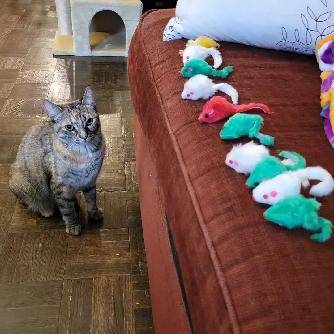 Once she realized Butter’s favorite toys were small, colorful mouse-shaped playthings, she began buying them in bulk. The packs were affordable and came with dozens at a time — perfect for a cat who loved to bat them around the house.