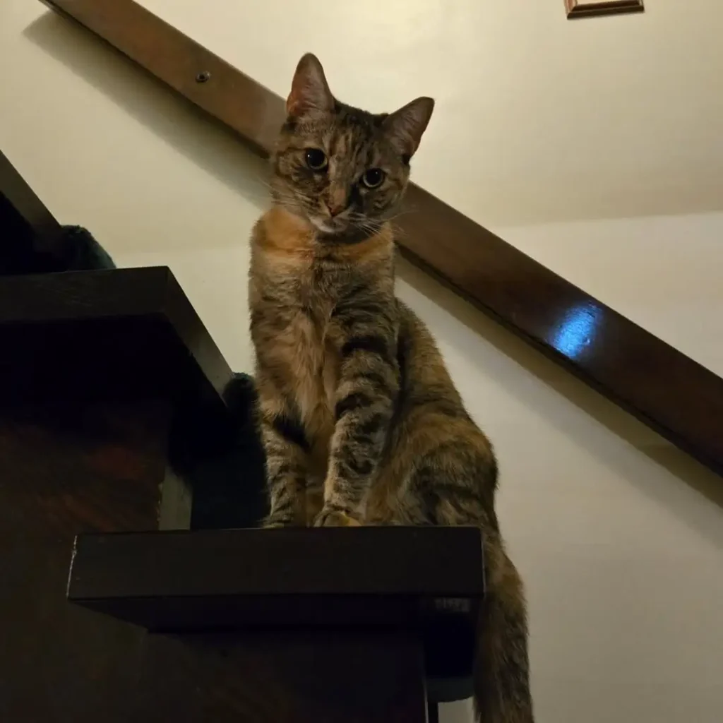 Chosed spotted Butter playing with a toy mouse on the stairway leading to the basement. Moments later, the toy vanished.