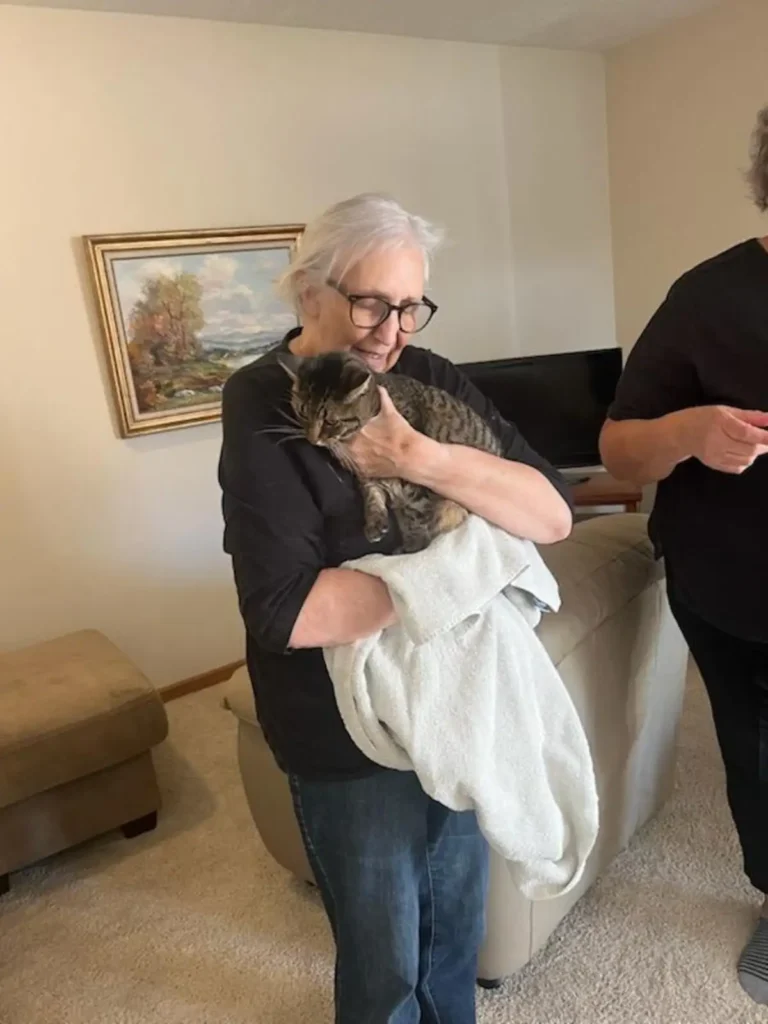 Today, Ellie is safely back home, curled up with Robinson as if nothing had happened. She’s on medication for her UTI and is already returning to her usual cuddly self.